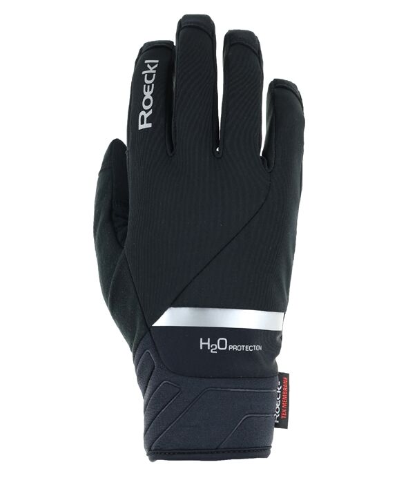 Der weich gefütterte Winterradhandschuh RANTEN 2 ist mit zahlreichen Performance-Features und -Materialien ausgestattet: Für Bestleistungen in Sachen Wetterschutz, Klimamanagement und Tragekomfort ist die dauerhaft wasserdichte, hochatmungsaktive ROECK-TEX MEMBRANE verantwortlich. Die großflächig silikonisierte Innenhand aus strapazierfähigem, wasserabweisend ausgerüstetem DURADERO Synthetiksuede ermöglicht einen rutschfesten Griff am Lenker und die feinfühlige Bedienung von Schaltung und Bremsen. Die Oberhand wurde aus ROECK-PROOF® Atlas gefertigt, ein PFAS-frei ausgerüstetes 3-Lagen-Softshell-Gewebe, das jede Bewegung der Finger und Hände elastisch mitgeht und zudem zuverlässig wärmt. Bezüglich Passform und Robustheit punktet der RANTEN 2 mit dem RAIL FINGER CUT mit leicht vorgekrümmten Fingern, bei dem das Material für noch besseren Verschleißschutz bis über die Fingerkuppen gezogen wurde. Dazu kommen ein ergonomisches Innenhanddesign mit Schaumstoffpolster und die COMFORT-INNOVATION von Roeckl Sports, eine nahtfreie Polsterung der beim Biken besonders beanspruchten Daumenbeuge. Der soft-wipe-Wischdaumen und die TOUCHSCREEN COMPATIBLE Funktion zum Tippen auf dem Smartphone mit Handschuh sind weitere praktische Details. Der breite, geschmeidige Neoprenbund mit Innenhand-Klettriegel ermöglicht einen passgenauen Sitz. Ein Lycra-Einsatz in Grün, Gelb, Rot oder Ton-in-Ton-Schwarz, der geprägte Bund, reflektierende Designelemente und das Roeckl Sports Reflect-Logo verleihen dem ansonsten schwarzen RANTEN 2 einen dynamischen Touch. Bei 30 Grad in der Maschine waschbar.